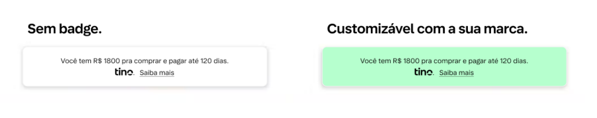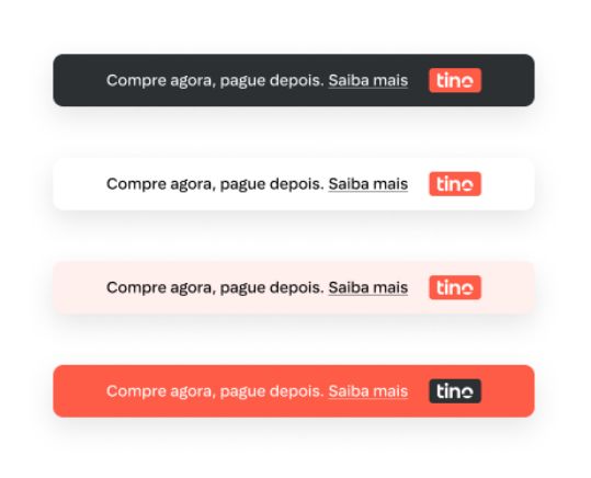 Personalize o banner de pagamento para que ele se ajuste perfeitamente à sua marca. Você pode alterar as cores, fontes, preenchimento, bordas e etc, mas garanta que o logotipo do Tino esteja presente (e seguindo as regras de aplicação descritas aqui), assim como a mensagem principal e o link para o “saiba mais”.