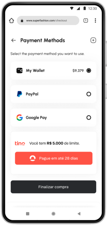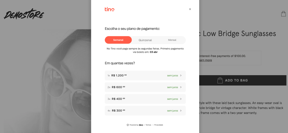 O Tino é um meio de pagamento que fica disponível na plataforma de vendas dos nossos fornecedores. Desta forma,disponibilizamos um modelo de integração via SDK onde o varejista visualizará a opção de pagamento ao selecionar o meiode pagamento de preferência. Faça com que seus varejistas saibam que o meio de pagamento do Tino está disponível antesque eles cheguem ao checkout e potencialize a sua conversão de compras e aumento de ticket médio.